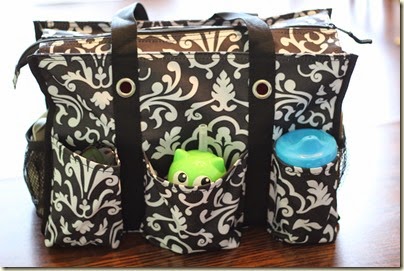 But wait! There’s more! The inside has a vinyl layer so leaks are super easy to clean. I’ve got diapers, wipes, diaper trash bags, wallet, cash, and a cute owl thermal lunch bag with snacks being kept cold.